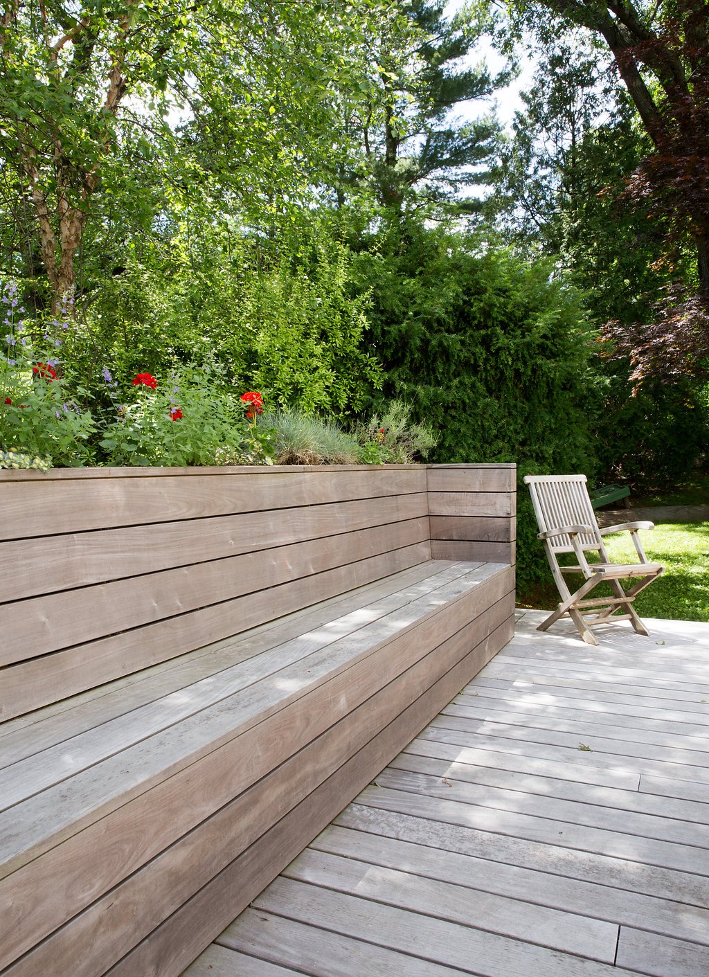 Integrated Ipe seating and planters are modern touches to Ipe deck.